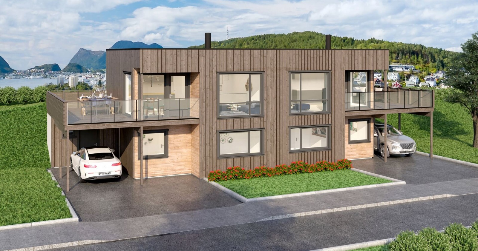 Bolig 1103 er en vertikaldelt tomannsbolig som egner seg for skrå tomter. Det er to soverom i første etasje og ett soverom/TV stue andre etasje. Fra kjøkkenet har du tilgang til en stor veranda på nesten 30m2. Boligen har egen carport, sportsbod og inngangsparti som er plassert under veranda. Noe som gir god skjerming mot vær og vind ved boligens inngangsparti.