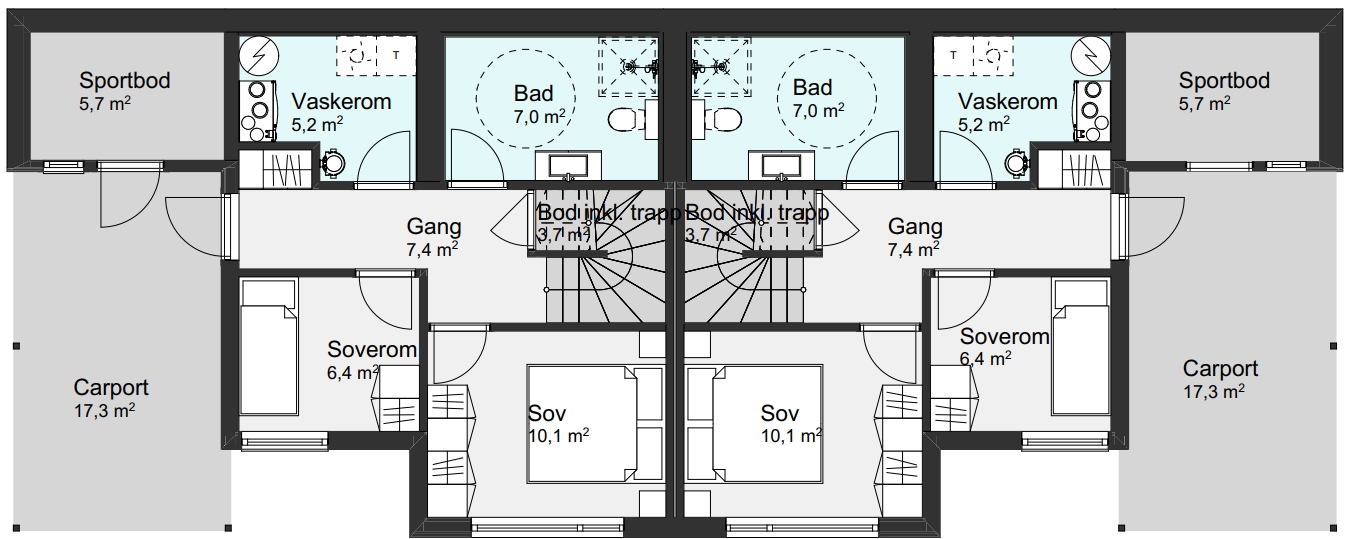 Bolig 1103 er en vertikaldelt tomannsbolig som egner seg for skrå tomter. Det er to soverom i første etasje og ett soverom/TV stue andre etasje. Fra kjøkkenet har du tilgang til en stor veranda på nesten 30m2. Boligen har egen carport, sportsbod og inngangsparti som er plassert under veranda. Noe som gir god skjerming mot vær og vind ved boligens inngangsparti.